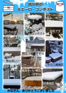 冬本番を迎える前に皆さんへお願いがあります。異常気象の影響で、この冬も突然大雪が降る日がありそうです。そんなドカ雪の朝は「雪のキエーロ、雪のコンポスト」 をパシャッ📸と撮影し、こちらへ送ってください♪♪